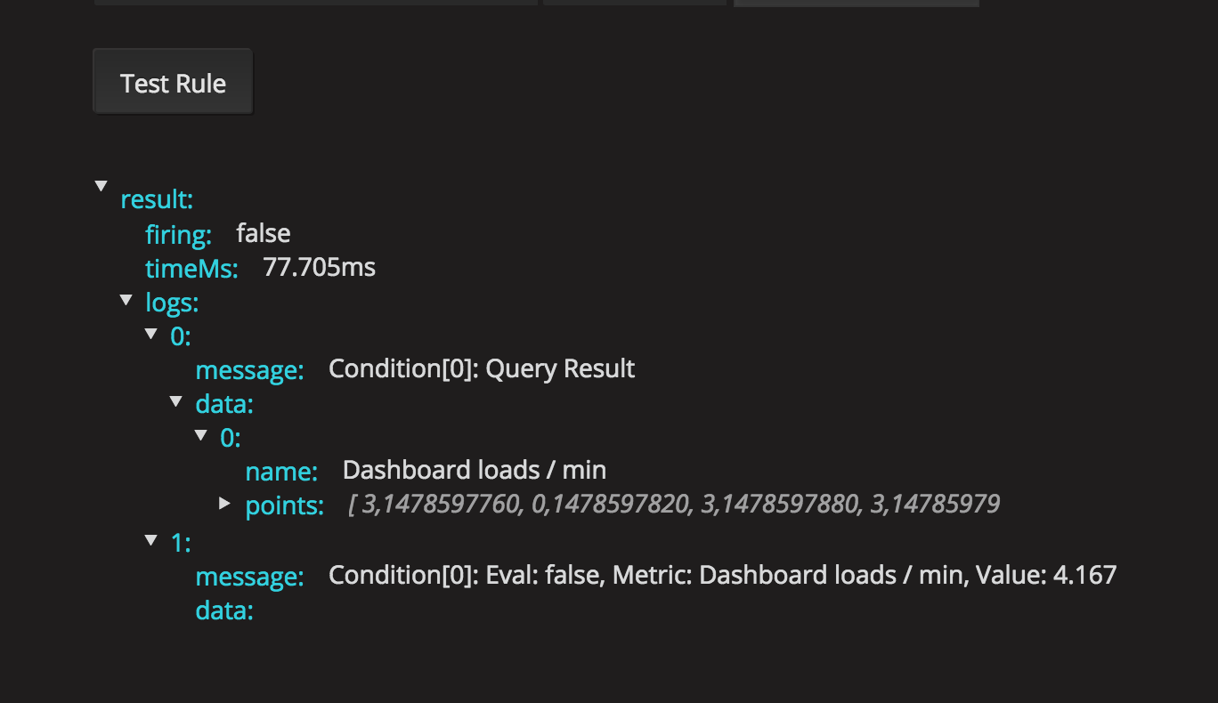 Die erste Stufe der Fehlersuche, die Sie durchführen können, ist ein Klick auf Regel testen. Sie erhalten ein Ergebnis zurück, das Sie so weit erweitern können, dass Sie die Rohdaten sehen können, die von Ihrer Abfrage zurückgegeben wurden.