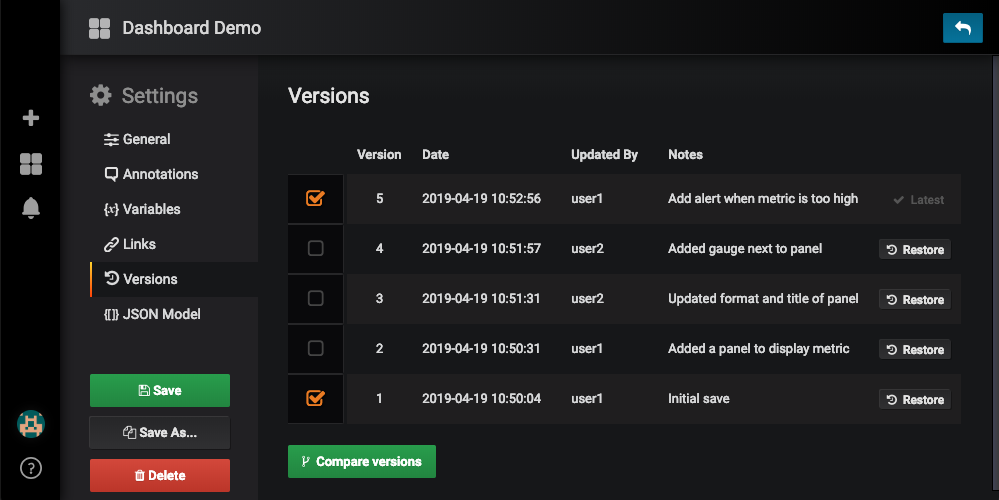 Immer, wenn Sie eine Version Ihres Dashboards speichern, wird eine Kopie dieser Version gespeichert, so dass frühere Versionen Ihres Dashboards nie verloren gehen. Eine Liste dieser Versionen ist verfügbar, indem Sie die Dashboard-Einstellungen aufrufen und dann “Versionen” im linken Seitenmenü auswählen.