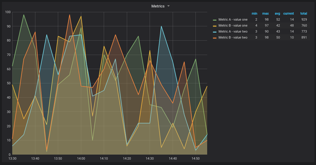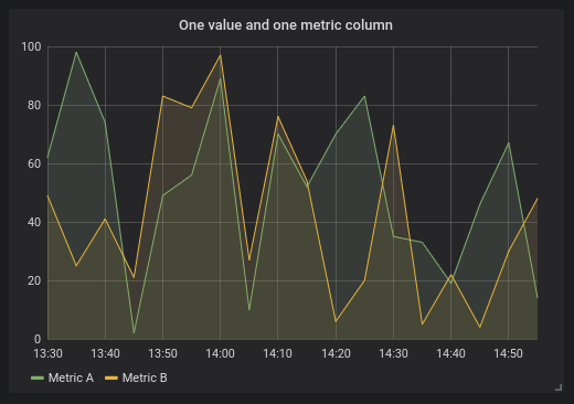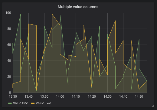 Für die folgenden Beispiele wird die Datenbanktabelle in Time series queries genutz. Nehmen wir an, dass wir vier Reihen in einem Diagrammfeld visualisieren möchten, z. B. alle Kombinationen der Spalten “WertEins”, “WertZwei” und “Messung”. Das Diagramm-Panel auf der rechten Seite visualisiert, was wir erreichen wollen. Um dies zu lösen, müssen wir zwei Abfragen verwenden:Erste Abfrage: