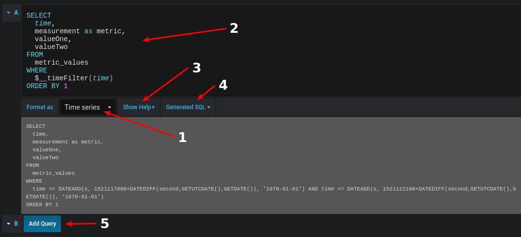 Zeitreihe(u. a. für die Verwendung im Grafik- oder Singlestat-Panel) oderTabelle(u. a. für die Verwendung im Tabellen-Panel). - Dies ist der eigentliche Editor, in dem Sie Ihre SQL-Abfragen schreiben.