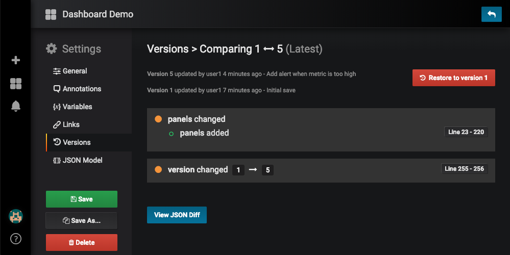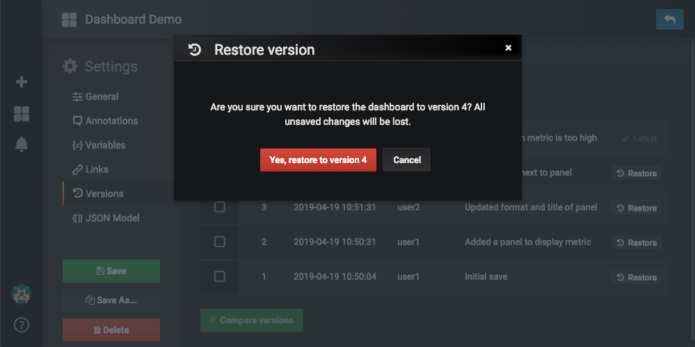 The dashboard version history feature lets you compare and restore to previously saved dashboard versions.