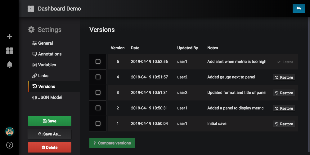 Immer, wenn Sie eine Version Ihres Dashboards speichern, wird eine Kopie dieser Version gespeichert, so dass frühere Versionen Ihres Dashboards nie verloren gehen. Eine Liste dieser Versionen ist verfügbar, indem Sie die Dashboard-Einstellungen aufrufen und dann “Versionen” im linken Seitenmenü auswählen.