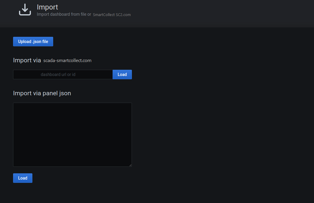 Von hier aus können Sie eine Dashboard-JSON-Datei hochladen, eine SmartCollect SC².com Dashboard URL hochladen oder Dashboard-JSON-Text direkt in den Textbereich einfügen.