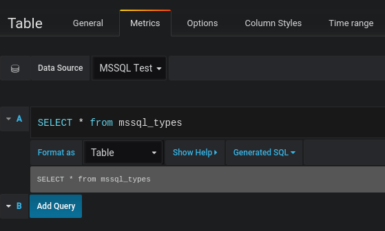 Sie finden den MSSQL-Abfrage-Editor auf der Registerkarte “Metriken” im Bearbeitungsmodus des Graph-, Singlestat- oder Tabellen-Panels. Sie gelangen in den Bearbeitungsmodus, indem Sie auf den Panel-Titel und dann auf Bearbeiten klicken. Mit dem Editor können Sie eine SQL-Abfrage definieren, um die zu visualisierenden Daten auszuwählen.