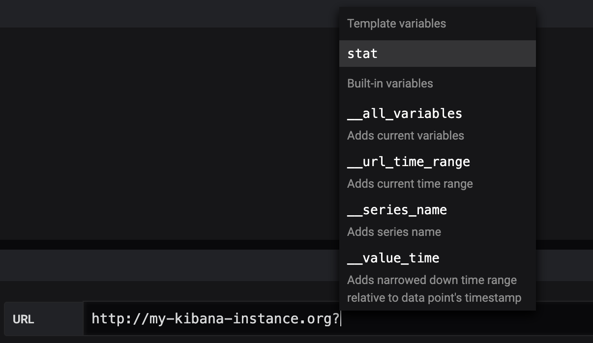 Sie können auch eine der im Dashboard definierten Vorlagenvariablen hinzufügen. Klicken Sie in das Feld URL und geben Sie dann “$” ein oder drücken Sie Strg+Leertaste oder Cmd+Leertaste, um eine Liste der verfügbaren Variablen anzuzeigen. Durch das Hinzufügen von Vorlagenvariablen zu Ihrem Bedienfeld-Link sendet der Link den Benutzer an den richtigen Kontext, wobei die relevanten Variablen bereits gesetzt sind. Weitere Informationen finden Sie unter Data link variables.