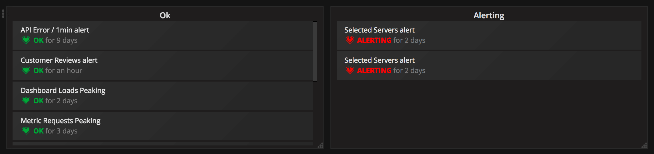 Im Bedienfeld “Alarmliste” können Sie die Alarme Ihres Dashboards anzeigen. Sie können die Liste so konfigurieren, dass der aktuelle Status oder die letzten Statusänderungen angezeigt werden. Sie können mehr über Alarme lesen in Alerts overview.